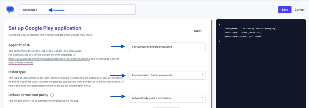4. Replace the Application ID with the native Samsung Messages App ID: