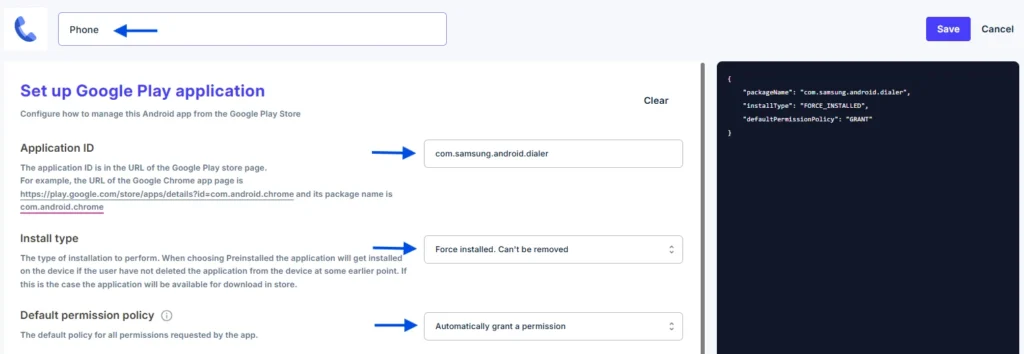 4. Replace the Application ID with the native Samsung Phone App ID:
